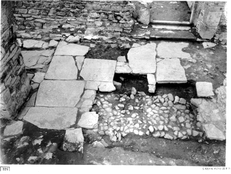 Partiet mellan pelarena i den östligaste bågen i mittskeppets nordmur från söder och norr. På undergrunden rester av pelaren mellan de östligaste, sedermera igenmurade romanska bågarna.