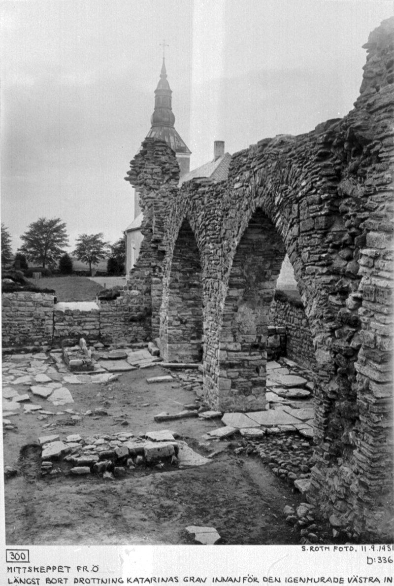 Mittskeppet från öster. Längst bort drottning Katarinas grav innanför den igenmurade västra ingången. I förgrunden lekmannaaltaret.