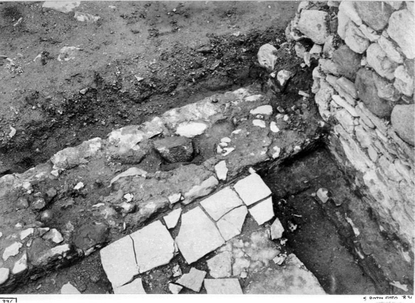 Resterna efter södra korsarmens sydmur (i äldsta kyrkan) från nordnordost uppifrån.