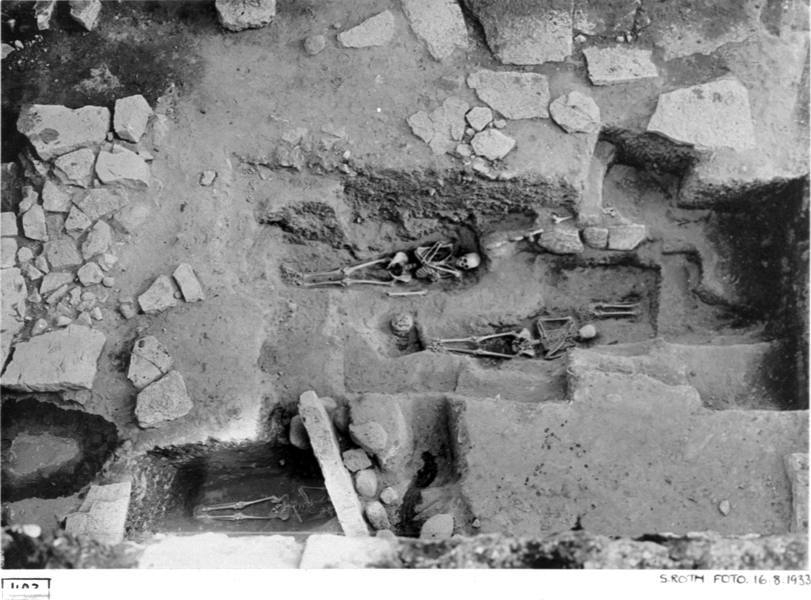 Partiet väster om lekmannaaltaret efter 1933 års utgrävning. Grav 9 och grav 10, kisthällar och rest sten.