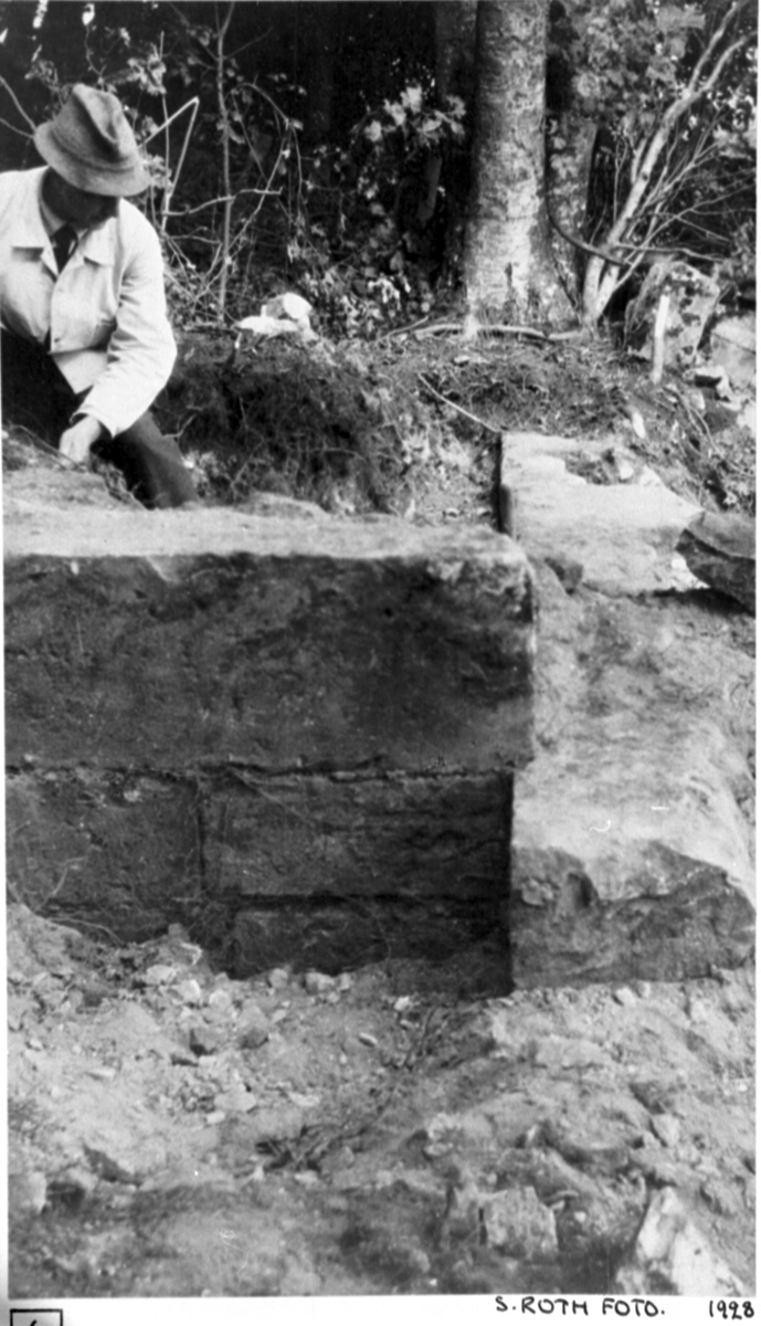 Södra koret nordöstra hörnet, från söder, under utgrävning. Nordmuren, östra muren. Till höger. Obs. förtagningen!