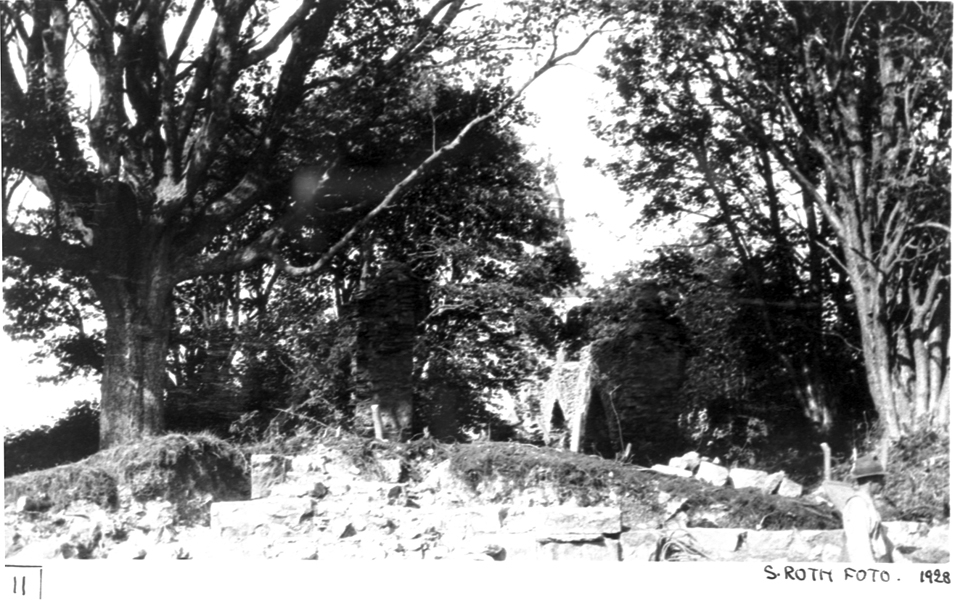 Södra delen av klosterkyrkans östra mur under utgrävning, från öster. Södra koret. Mittkoret.