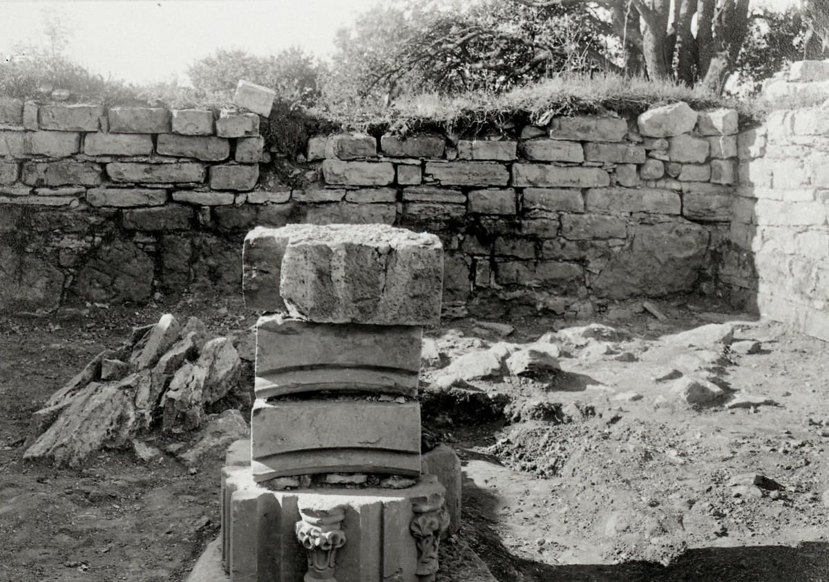 Kapitelsalen. Mittpelaren från s, till vänster nedrasade valvstenar.