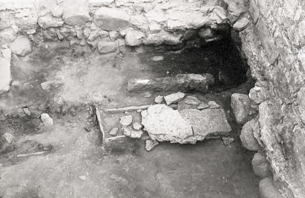 Kapitelsalens sv. hörn från n. Grav 12. Vid pilen träfragment.