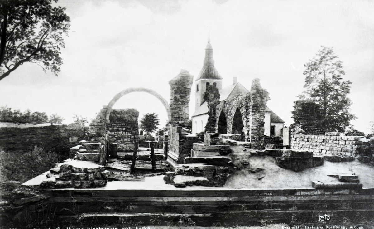 Gudhems klosterruin och kyrkan i bakgrunden.