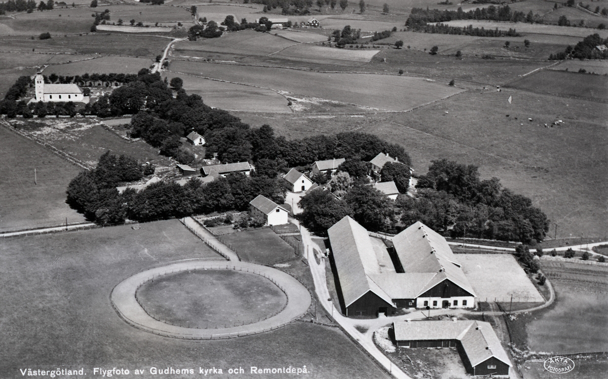 Flygfoto av Gudhems kyrka och remontdepå.