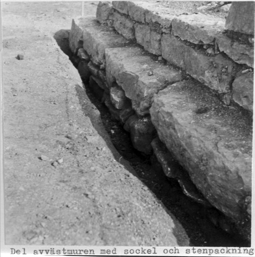Lovene kyrkoruin. Del av fästmuren med sockel och stenpackning.
