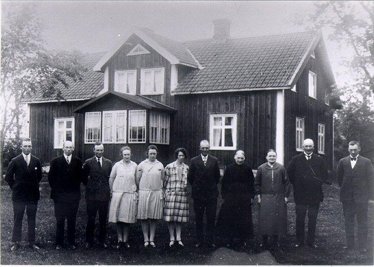 Övre Stommen Smeby, Slöta. Från vänster: Sven Eliasson Stommen, (Einar) Karlsson Hasselbacken Gökhem, Oskar Eliasson Stommen, Annie Eliasson Stommen. Alice Eliasson Stommen, Ester Karlsson Hasselbacken Gökhem, Karl Eliasson Stommen, "mor" på Hasselbacken, Ellen Eliasson Stommen, Frans Eliasson Stommen, - Karlsson Hasselbacken Gökhem.