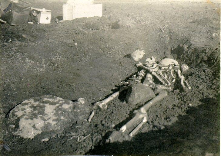 Ledsgården, Gökhem. Kvinnograv från 600-talet. Påträffad i potatisfåra. Skelettet i utsträckt läge. Stenblock invid fotändan, kraniet trepanerat.