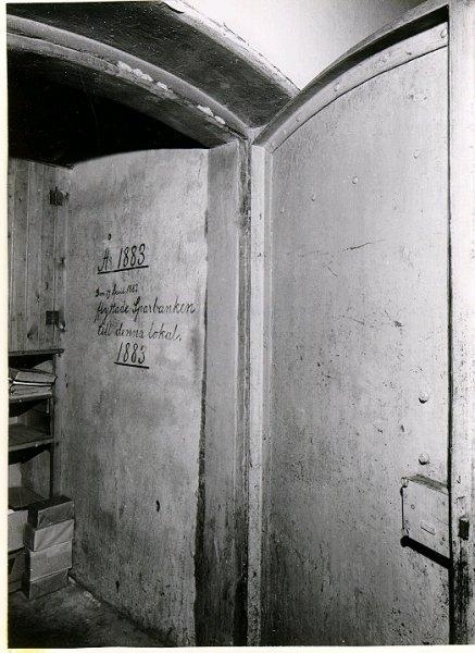 Kassavalv i Lindgrens blomsterhandels lokaler med texten "den 19 april 1883 flyttade Sparbanken till denna lokal".