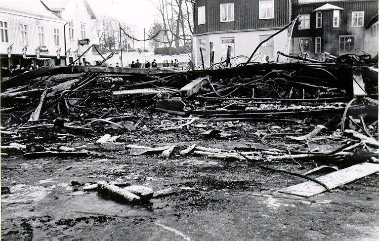 Kv. Källarmästaren, Storgatan 3. Veramagsinet, "Munkagården", efter branden i december 1963. I bakgrunden Östertullsgatan.
