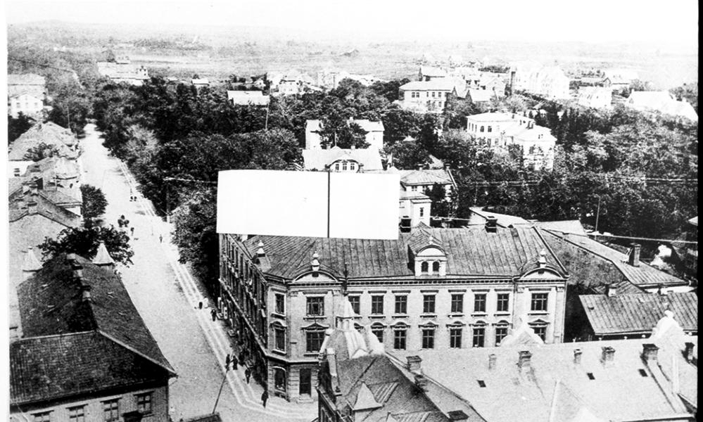 Titel: S:t Olofsgatan mot norr. Korsningen med Storgatan. Till höger Norders hörna. Till vänster Jouvins hotell.