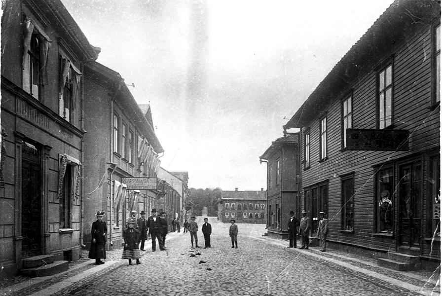 Storgatan innan husen byggdes ihop såväl vid Havannamagasinet som vid Wennblads järnhandel. På detta foto står gamla "Thulinstomten" kvar. Foto från väster
