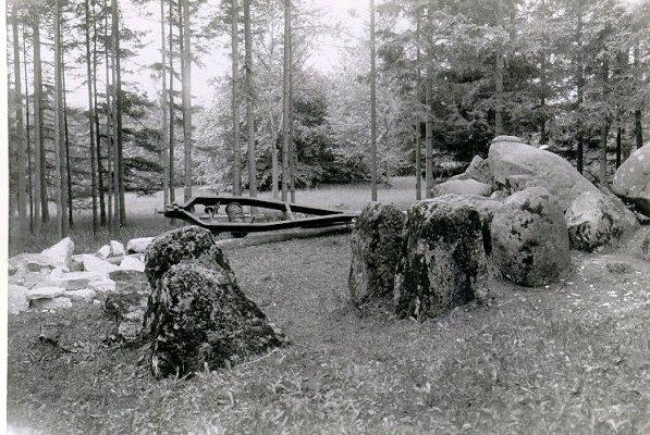 Planteringsförbundets park, S:t Olofsgatan. Gånggriften Kyrkerör före restaureringen 1928. Yttre delen av gången sedd från ostnordost.