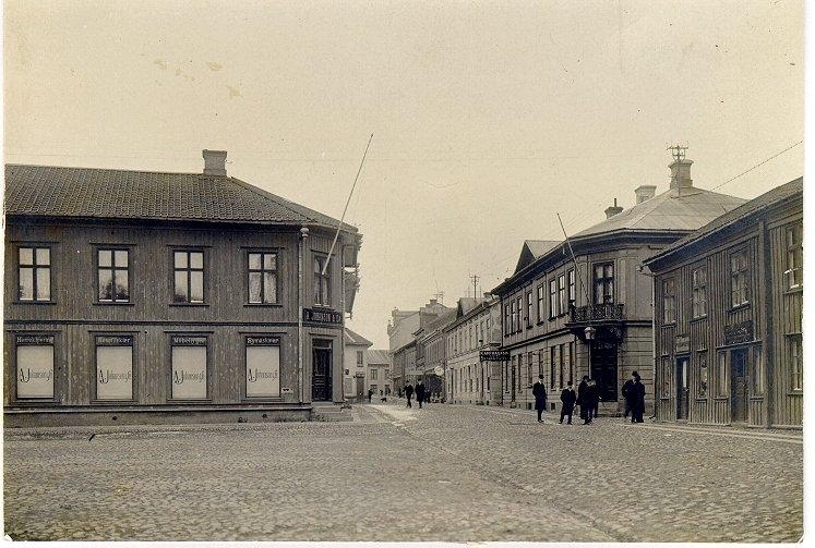 Stora torget. Stadens torg 1902. Stora torget 19 (A. Johansson & Co. Storgatan 18) Obs. kullerstensbeläggningen. Stora torget stensattes under åren 1837-1841.
