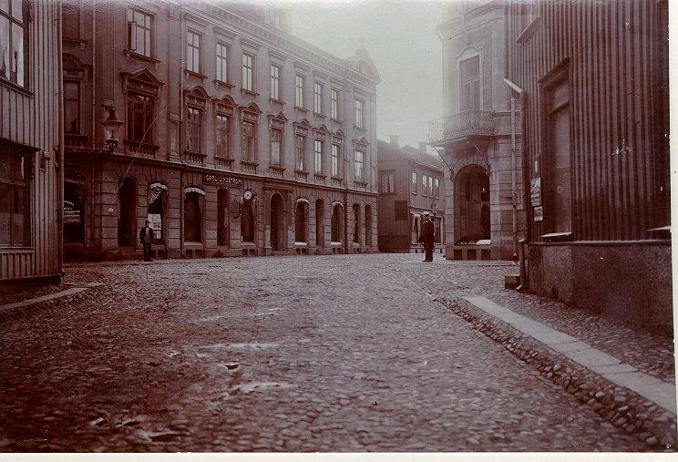 Kv. Guldsmeden. S:t Olofsgatan - Storgatan, Norders Bokhandel t.v, och Kilanderska t.h.
