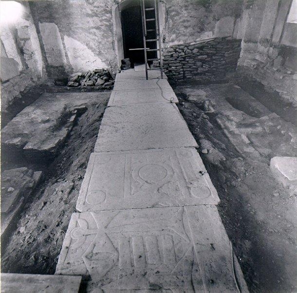S:t Olofs kyrka. Restaureringen 1958-1961. Gravstenar i mittgången nedlagda 1959-61.