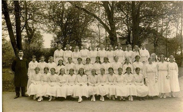 Konfirmander. Kyrkoherde Fritz Wetterholm. Första raden från vänster: 4. Svea Wallman. Längst till höger: Aina Bogren. Andra raden från vänster: 7. Anna Blom, 8. Elsa Fredriksson.