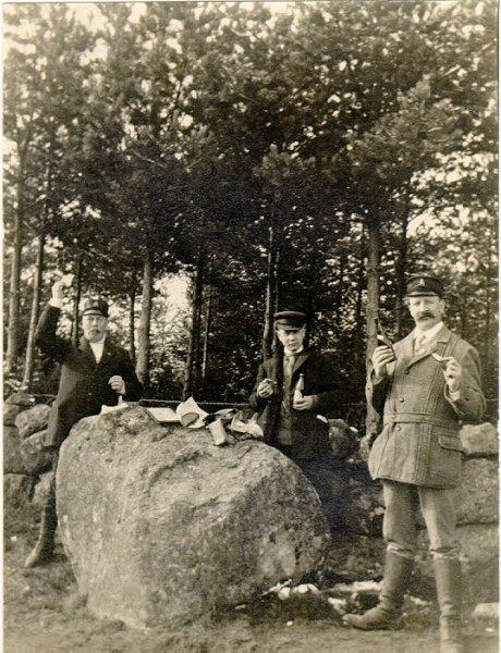 Från den stora fältmanövern 1912. Falköpingsbor på rast i Hällestadskogen. Mannen längst t.h. Bruno Larsson /Spritbolaget/.