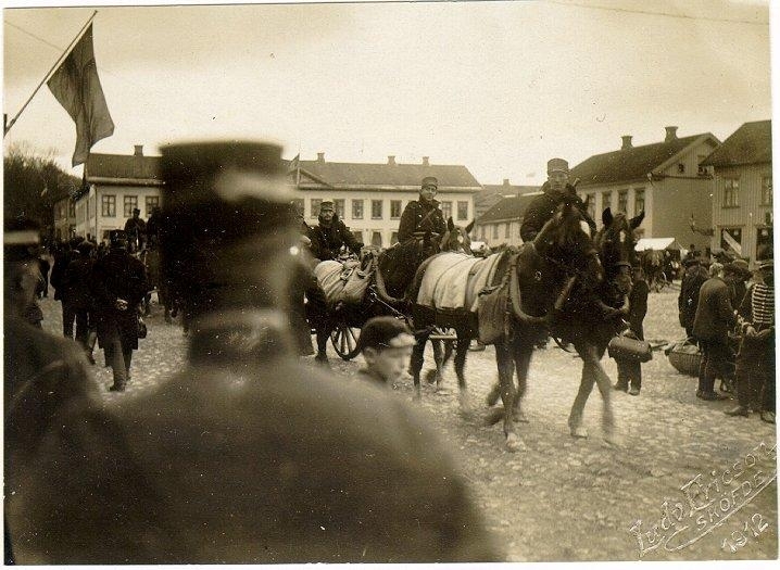 Från fältmanövern 1912. Stora torget med spritbolagets hus i fonden. Armémanövern pågår.