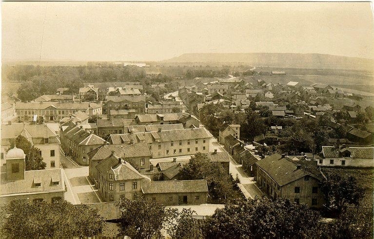 Utsikt från kyrktornet. Utsikt mot sydost och Ålleberg. Nygatan och Ållebergsvägen. Nedtill åt vänster: Gamla Brandstationen med slangtorn.