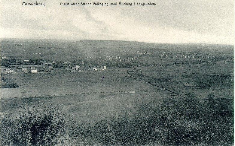 Foto från bergsplatån. Utsikt över staden Falköping med Ålleberg i bakgrunden.