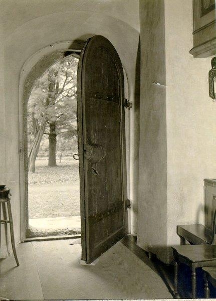 S:t Olofs kyrka. Södra ingången inifrån kyrkan. Under golvet ligger Lars Andersson Hvass begravd.