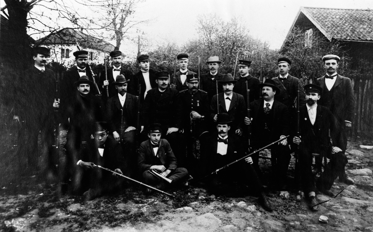 En grupp ur Falköpings Skyttegille efter hemkomsten från den första skjutövningen som ägt rum i Sverige mot flyttbara personliga mål (-tavlor) å okända avstånd i obekant terräng (på Ålleberg). Från vänster: Övre raden: Bruno Larsson, Th.Dimberg, Ture Kilander, Isak Haglund, Erik Kilander, John Swedmark, Mårten Lindgren, Anders Mörk, skräddare Odh. Mellersta raden urm. Larsson, redaktör Jahn, Leop.Engström, fanj. Ahlson, Axel Spets, polis Högberg, S.G. Svensson. Längst fram: Johan Karlsson, Magnus Lindgren, faktor Pettersson.