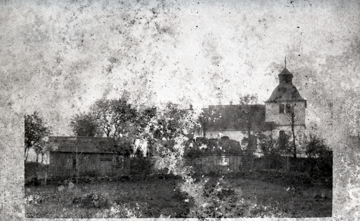 Luttra kyrka med fattighuset och Kajsas stuga.