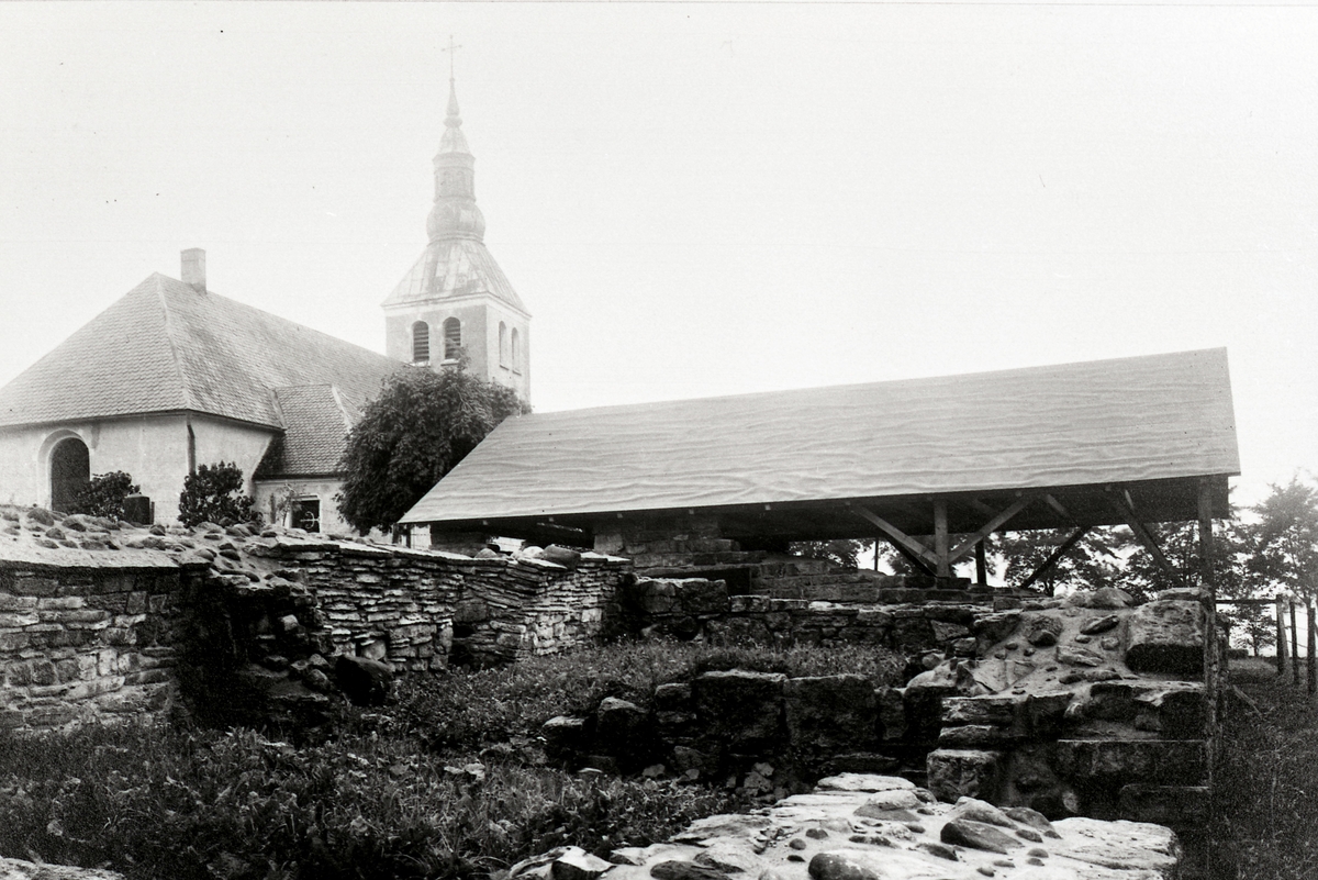 Norra längan mot sydväst med skyddstak över abedissans bostad. Gudhems kyrka syns i bakgrunden.