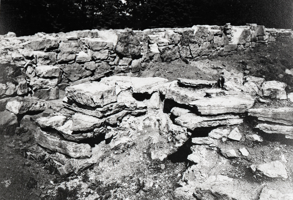 Västra korsgången. Östmuren. Gravöppningshål i murens norra del från sydväst.