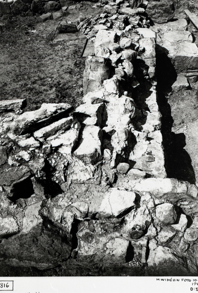 Östra huset. Sydöstra hörnet från söder. T.v. murkanalen i södra väggen.