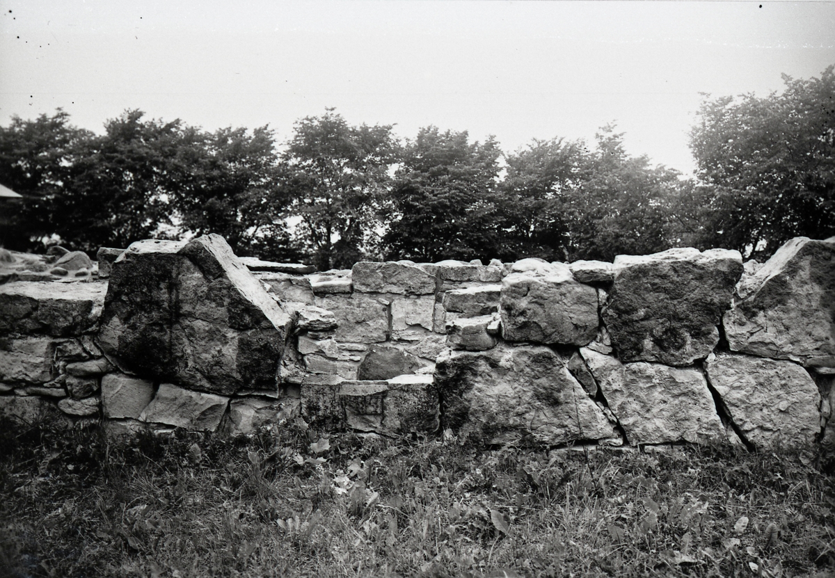 Norra korsgångens sydmur. Utsidan. Mittpartiet från söder före framgrävningen av bottenskiftet.