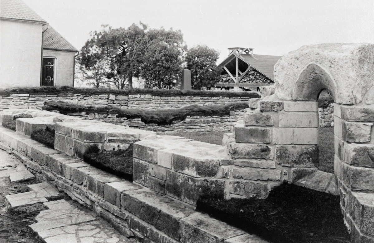 Södra korsgången. Norra muren efter torvningen, från sydost.