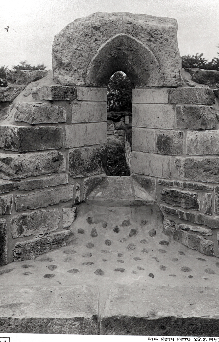 Södra korsgångens nordmur. Östra fönstret återuppsatt, från söder.