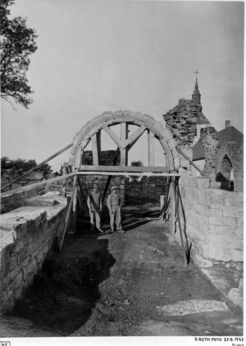 Södra koret. Valvbågen uppsatt på ställning från öster.