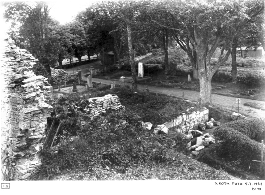 Södra tvärskeppet från nordväst före utgrävningen, del av kyrkogården syns.