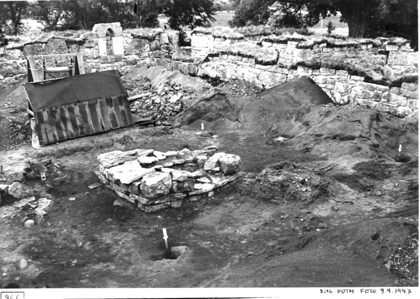 Klostergården med stengrunden från ssv. B = brandlager. Vid pilarna stolphål.