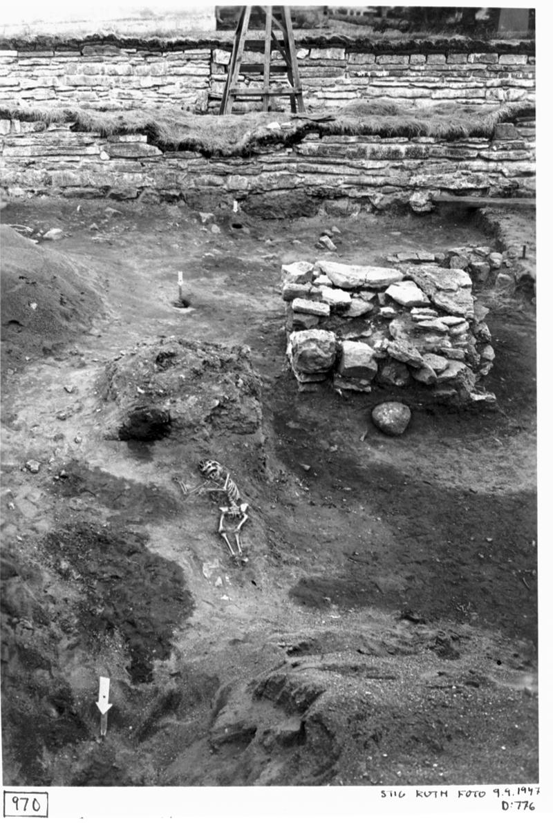 Klostergården. Från ö. stengrunden. Barnskelett. Vi pilarna stolphål 1, 2, 5.