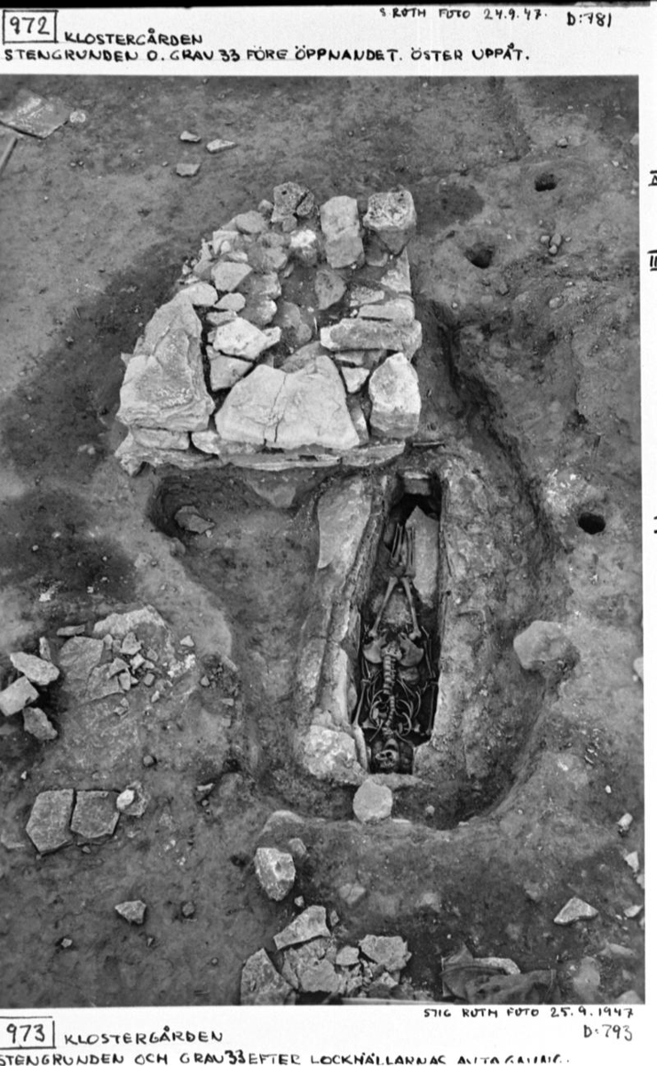 Klostergården. Stengrunden och grav 33 efter lockhällarnas avtagning. Stolphål 4, 3, 2.
