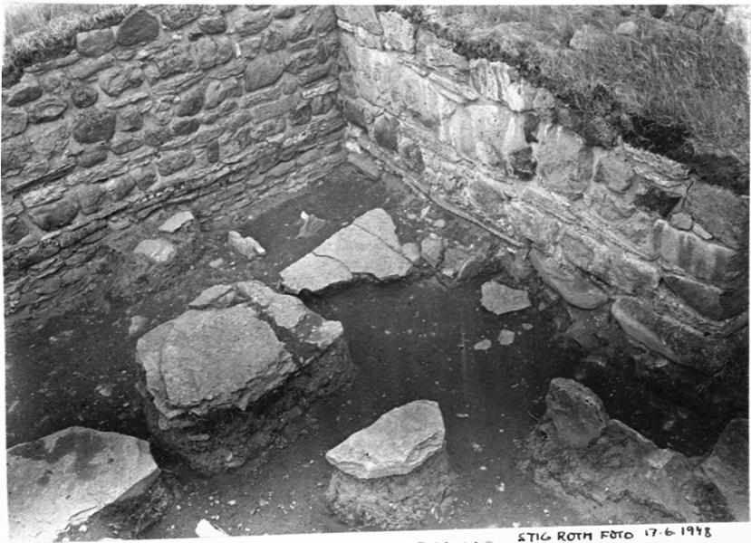 Yttre vinkeln mellan kyrkans södra långhusmur och korsarmen. under utgrävning 1948. Foto från sydväst.