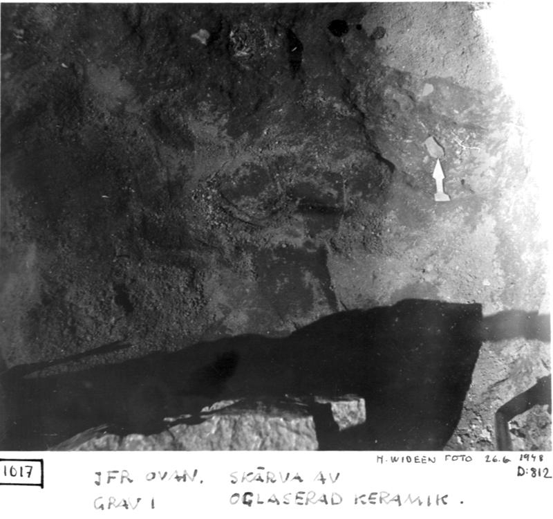Grav 1. Pilen visar på en skärva av oglaserad keramik.