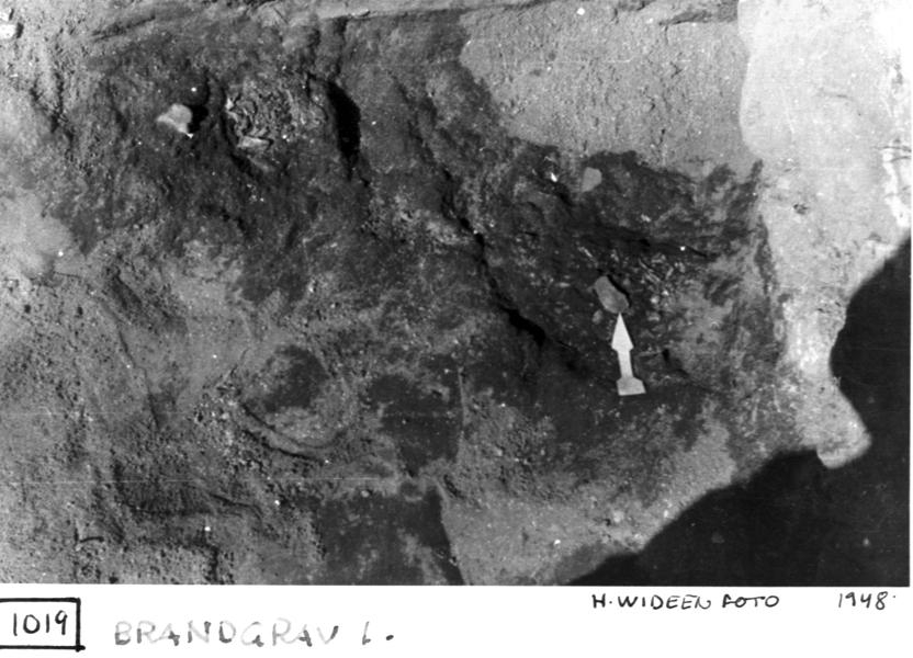Grav 1. Pilen visar på en skärva av oglaserad keramik.