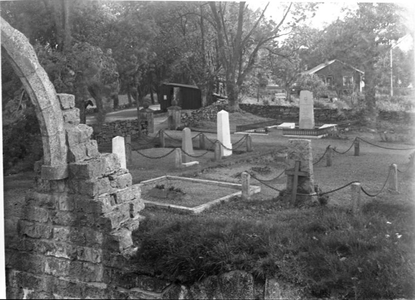 Bågen i sydkoret och kyrkogårdens s.ö. hörn från nordväst. I fonden arbetsskjulet.