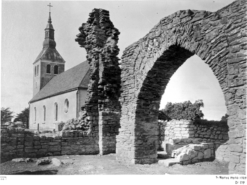 Mittskeppets nordvästra hörn från sydost. Till vänster v. ingången igenmurad. Till h. norra sidoskeppet med altare. Gudhems kyrka syns i bakgrunden.
