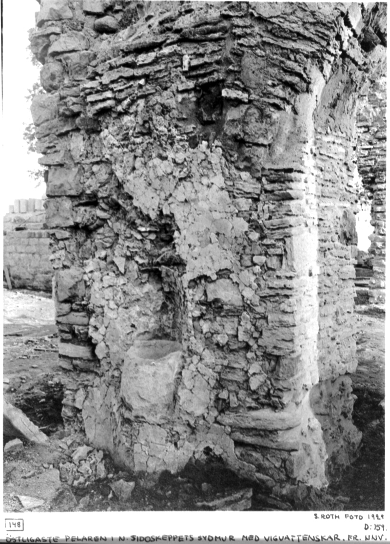 Östligaste pelaren i norra sidoskeppets sydmur med vigvattenskar. Från nordnordväst