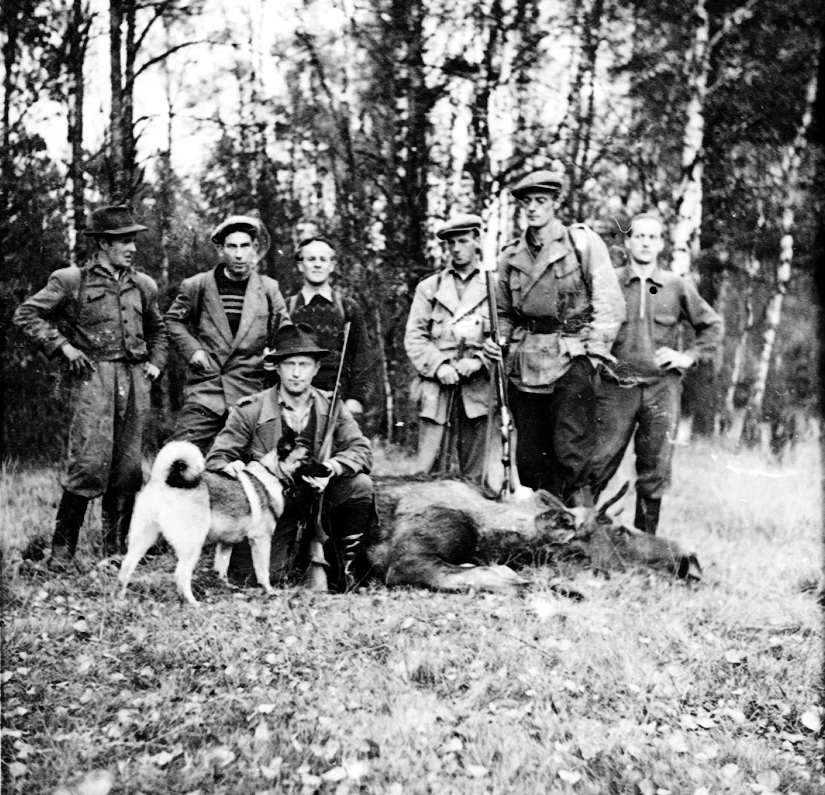 Jaktlaget med hund vid sin skjutna älg. Fr.v. Ingvar Odlander, Gustav Willander, Erik Johansson (Videholmen), Georg Karlsson, Elias Johansson, Rune Johansson, Gustav Hammar (vid hunden)