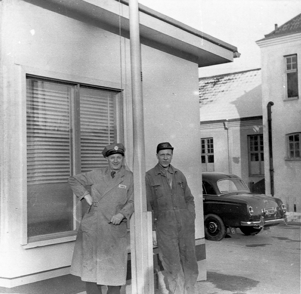 Bensinstation vid Per Larsgatan/S:t Olofsgatan. T.v. förre ägaren Bertil Englund, t.h. Bengt Gustavsson. Smörjhallen och tvätthallen.