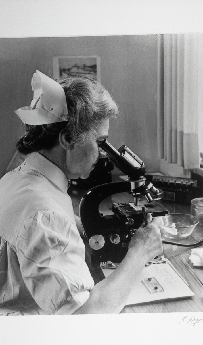 "Vid mikroskopet. Syster Elin räknar blodkroppar".