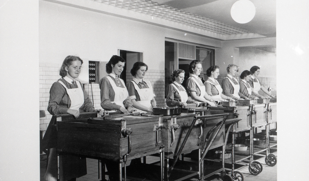 "Maten går ut till avdelningarna" (Lasarettet). Från utställningen "Falköping i bild" 1952.